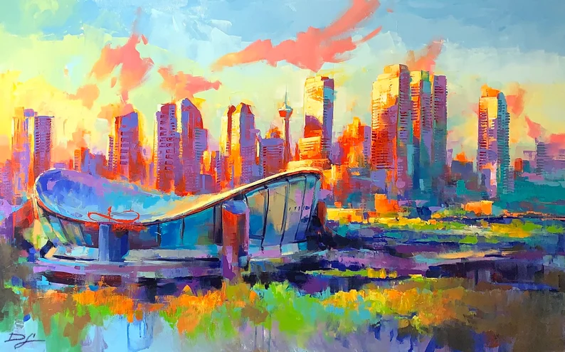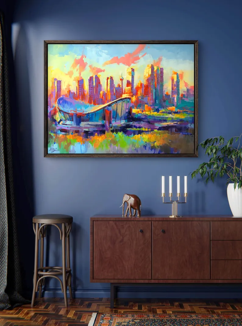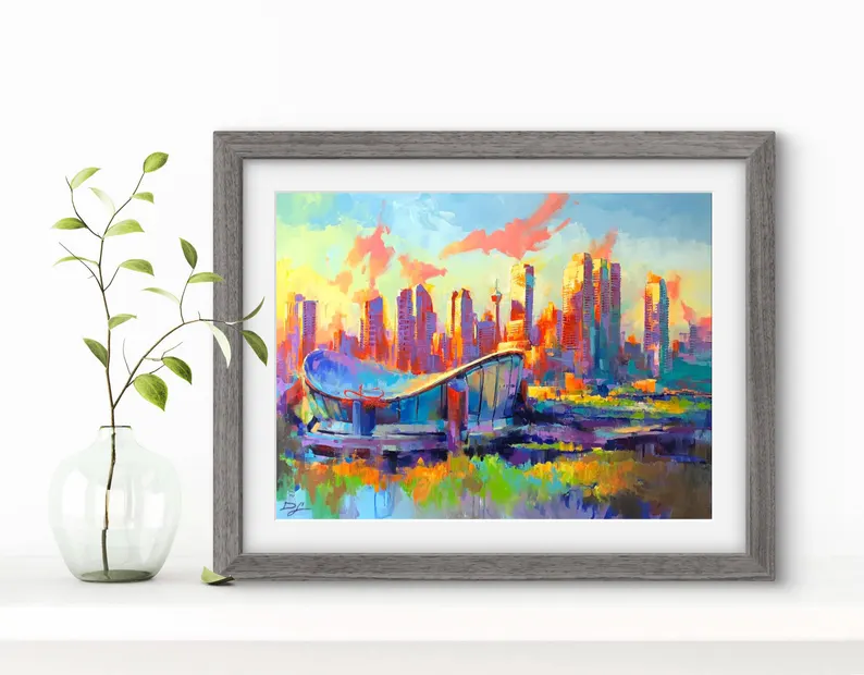 Home of Sunshine Print, City Canvas, Calgary Print, Cityscape Art, Acrylic Painting, Canadian city, downtown Artwork