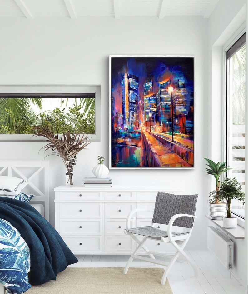 PATH OF LIGHT Print, Cityscape Canvas, Calgary Art Print, City Poster, Downtown Decor, Night City art, City Wall Art, Colorful Artwork