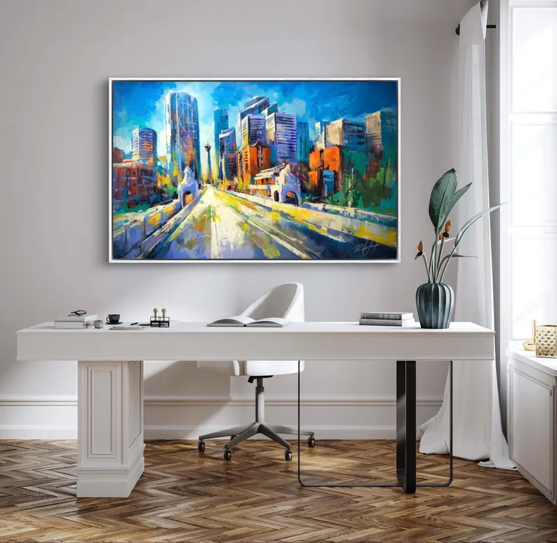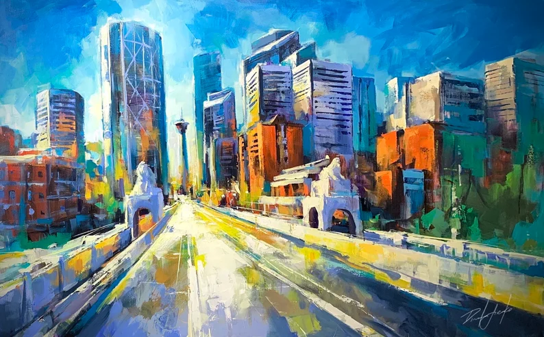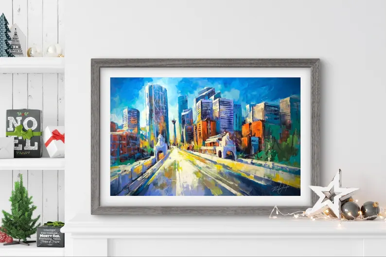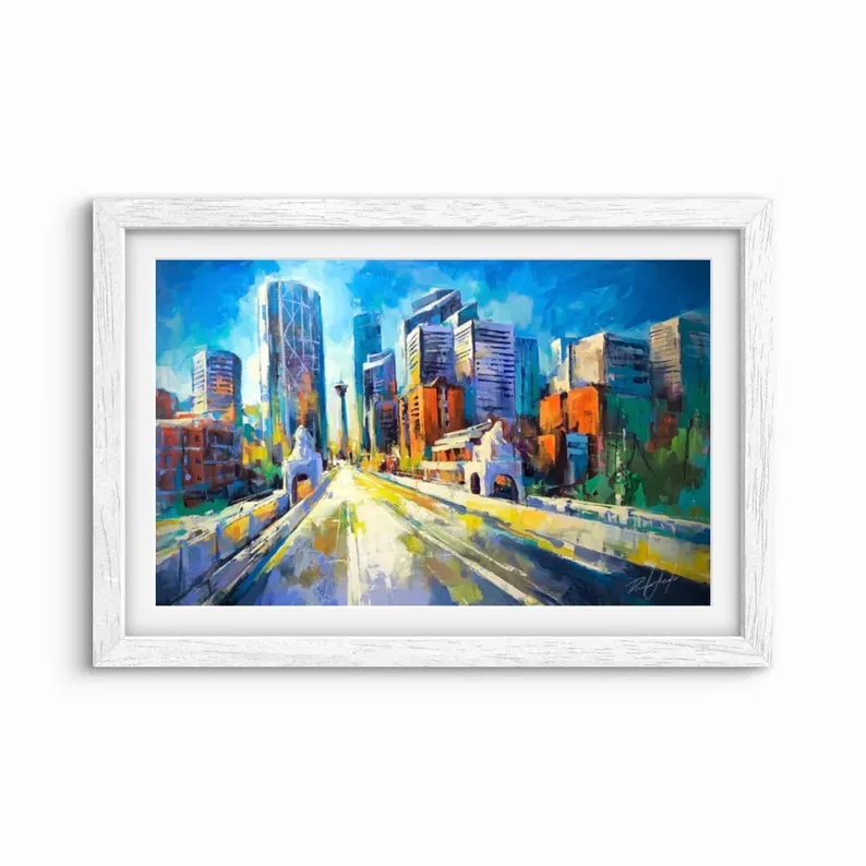 PATH OF SUNLIGHT Print, Cityscape Canvas, Calgary Skyline, Calgary Art, Downtown Decor, Daylight City Art, City Wall Art, Colorful Artwork